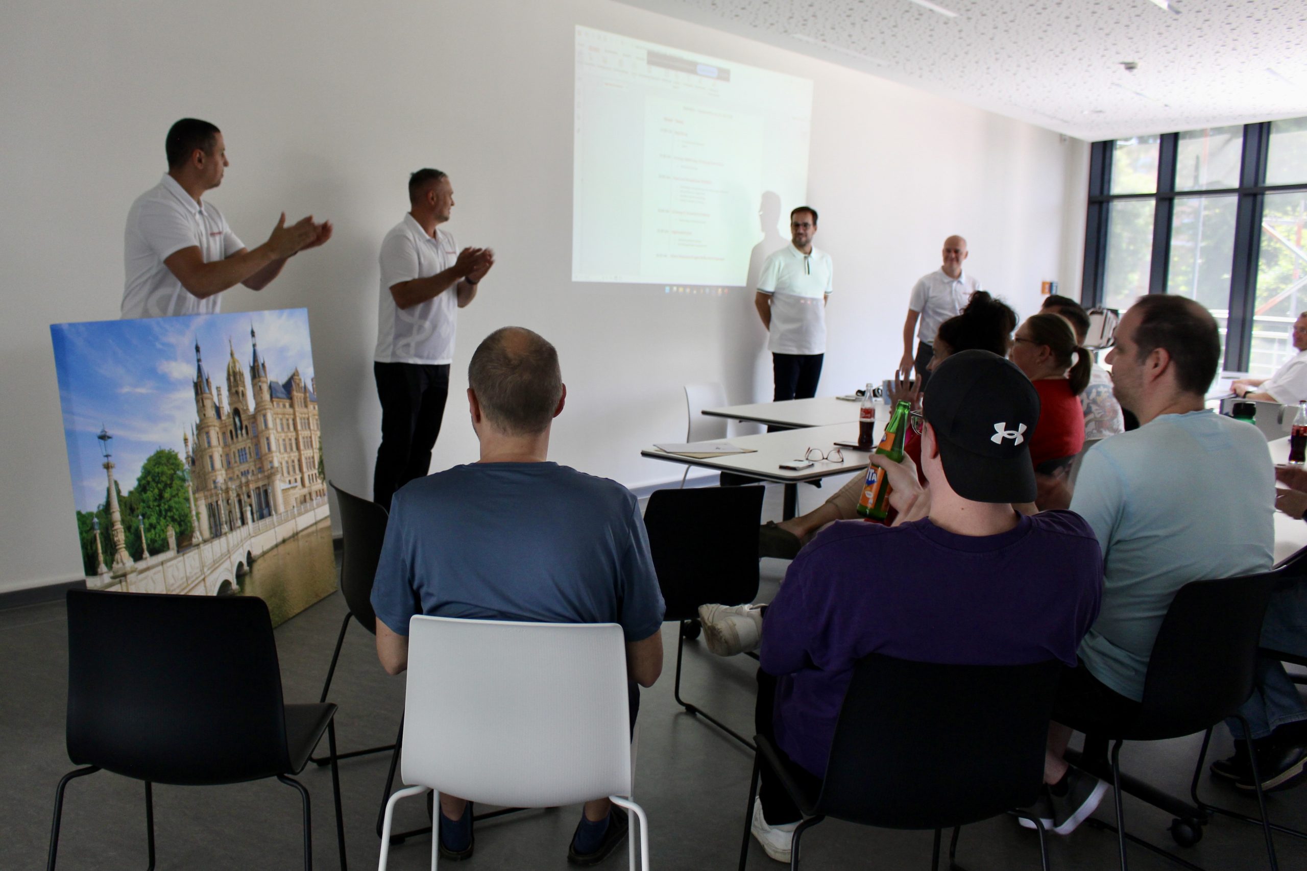 Zur Einweihung des neuen Büros überreichten wir dem Schweriner Team feierlich eine Leinwand mit dem Motiv des Schweriner Schlosses – ein Symbol für die starke Verbundenheit mit der Region und einen tollen Start am neuen Standort.