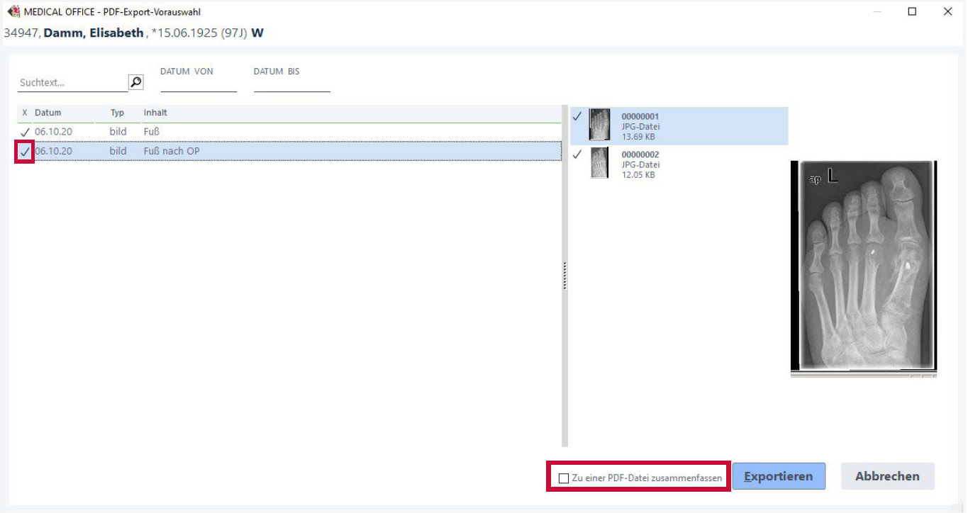 Geschrieben am 19. April 2023 Neue Funktion “PDF-Export” im Krankenblatt Einträge und Dateien in einer PDF-Datei exportieren Mit der neuen Funktion des PDF-Exports in MEDICAL OFFICE ist es möglich, einzelne Einträge, beliebig viele oder das gesamte Krankenblatt eines Patienten auszuwählen und in das PDF-Format zu exportieren. Um den PDF-Export zu starten, gibt es verschiedene Möglichkeiten. Für den Export eines einzelnen Eintrags empfiehlt sich, diesen direkt über den Eintrag und die rechte Maustaste → PDF-Export zu starten. Für den Export mehrerer Einträge oder des gesamten Krankenblatts kann dieser entweder über das Krankenblattmenü→Aktionen→PDF-Export oder mit dem Tastenkürzel „Alt+P“ gestartet werden. In dem Dialog für die Erstellung der PDF-Export-Vorauswahl können durch das Setzen des Hakens vor den einzelnen Einträgen die zu exportierenden Einträge ausgewählt werden. Werden mehrere Einträge/Dateien ausgewählt, besteht zudem die Option, diese zu einer PDF-Datei zusammenzufassen. Hierfür ist an der entsprechenden Stelle, der Haken zu setzen. Jedes Dokument kann allerdings auch in eine eigene PDF-Datei exportiert werden. Alle erstellten Dateien können anschließend in einem beliebigen Verzeichnis gespeichert werden. Sollte ein Krankenblatteintrag keine exportierbare Datei enthalten, wird das von MEDICAL OFFICE erkannt. Es wird dann nur der Inhaltstext in einer Krankenblattübersicht ausgegeben. Die Darstellung der Spalten im Krankenblatt ist genau so wie die Darstellung in der PDF-Export-Vorauswahl. Hinweis: Weitere ausführliche Informationen zum PDF-Export sind in der Online-Hilfe (F1) von MEDICAL OFFICE enthalten.